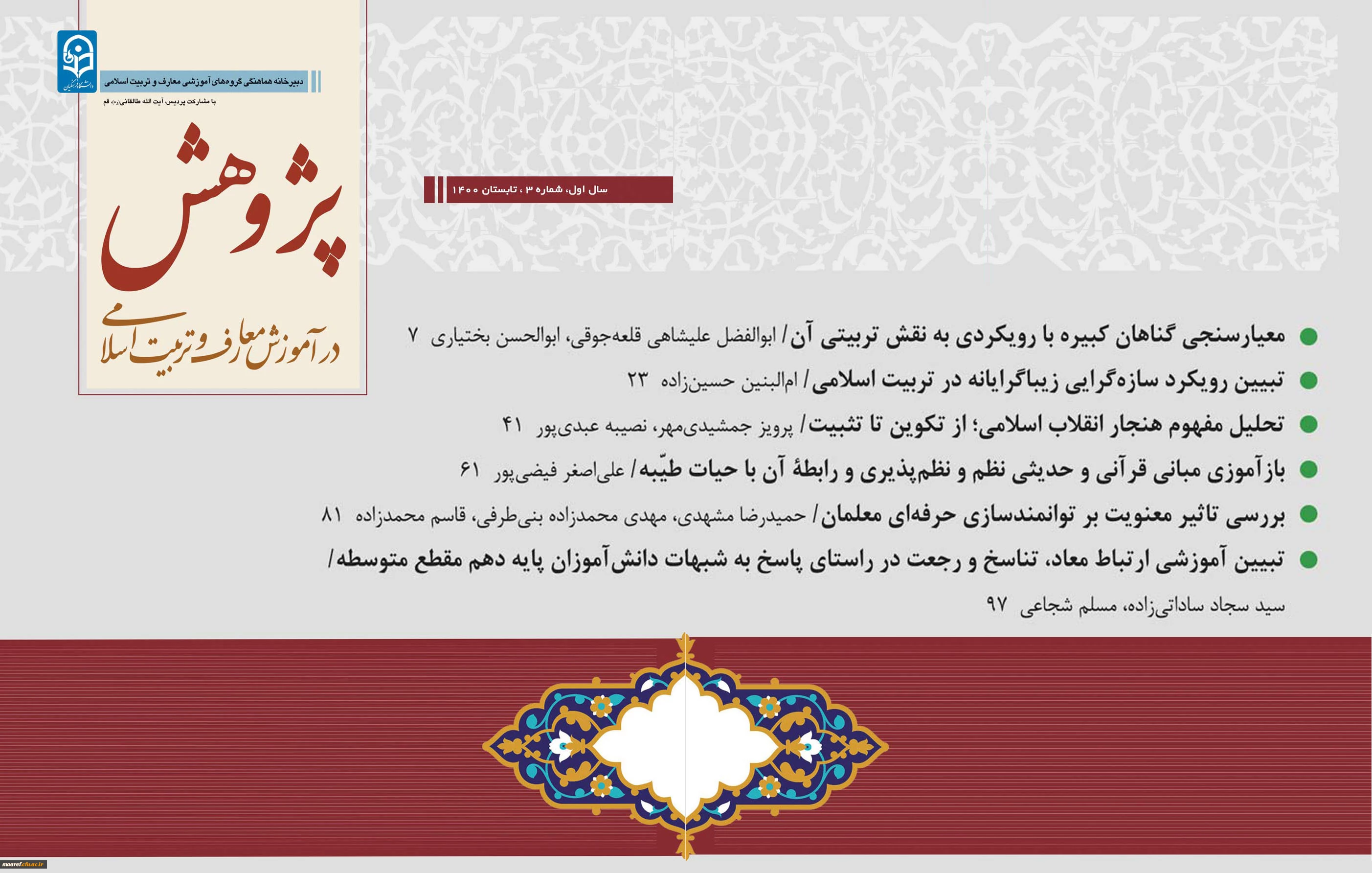 شماره سوم(تابستان 1400) فصلنامه علمی- تخصصی« پژوهش در آموزش معارف و تربیت اسلامی» منتشر شد 2