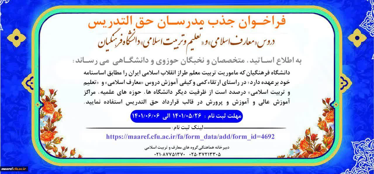 سومین فراخوان جذب مدرسان حق التدریس دروس «معارف اسلامی» و «تعلیم و تربیت اسلامی» دانشگاه فرهنگیان 2